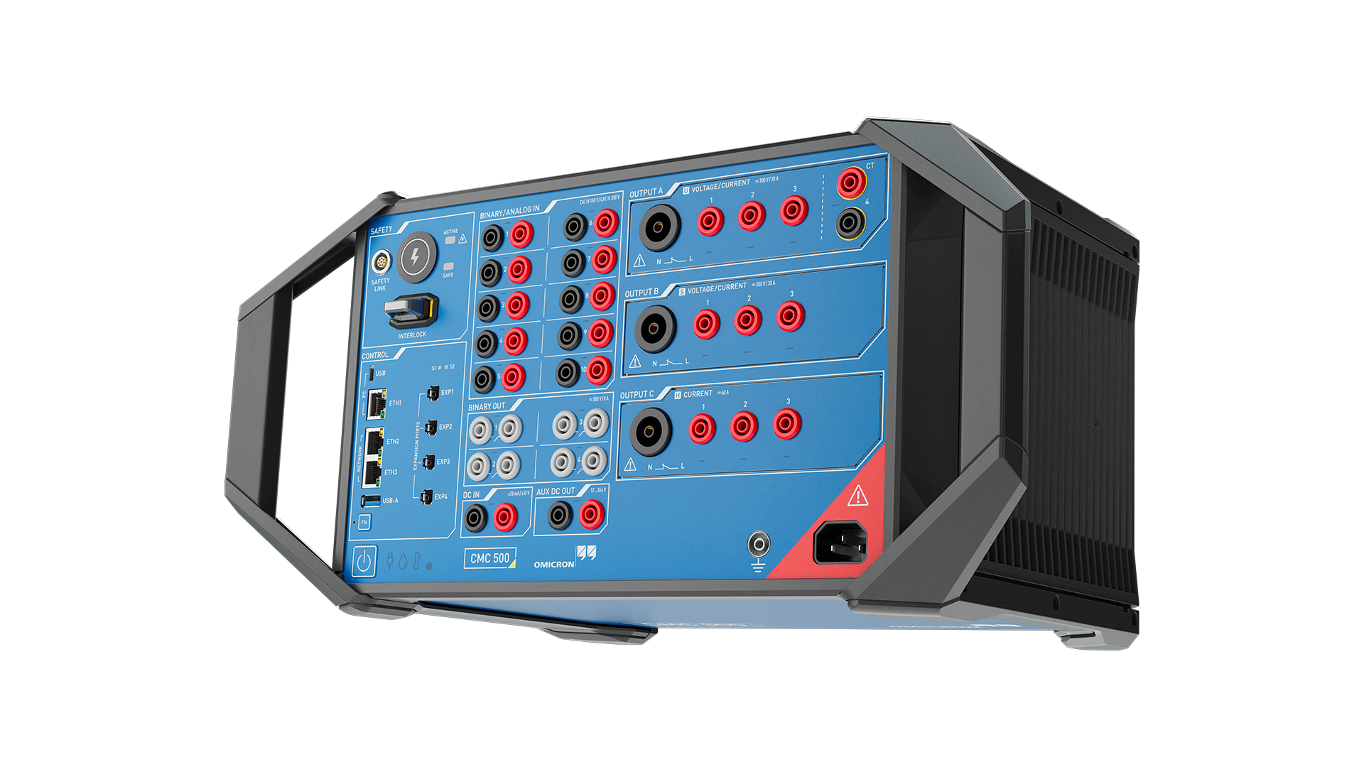 CMC 500 全面支援 IEC 61850 數位通訊協定,包括 GOOSE、MMS 及 Sampled Values(支援 IEC 61869),可涵蓋智慧化電力系統的各類測試需求。儀器具備強大的輸出能力,提供多達 7 組電壓或 10 組電流輸出,並可注入高達 450 A 的電流,適用於保護電驛、比流器(CT)、斷路器等多種設備的功能與性能驗證。並依 ISO 13849-1 與 EN 50191 規範配備 INTERLOCK、安全按鈕與狀態指示燈,兼顧高效能與現場操作安全。
