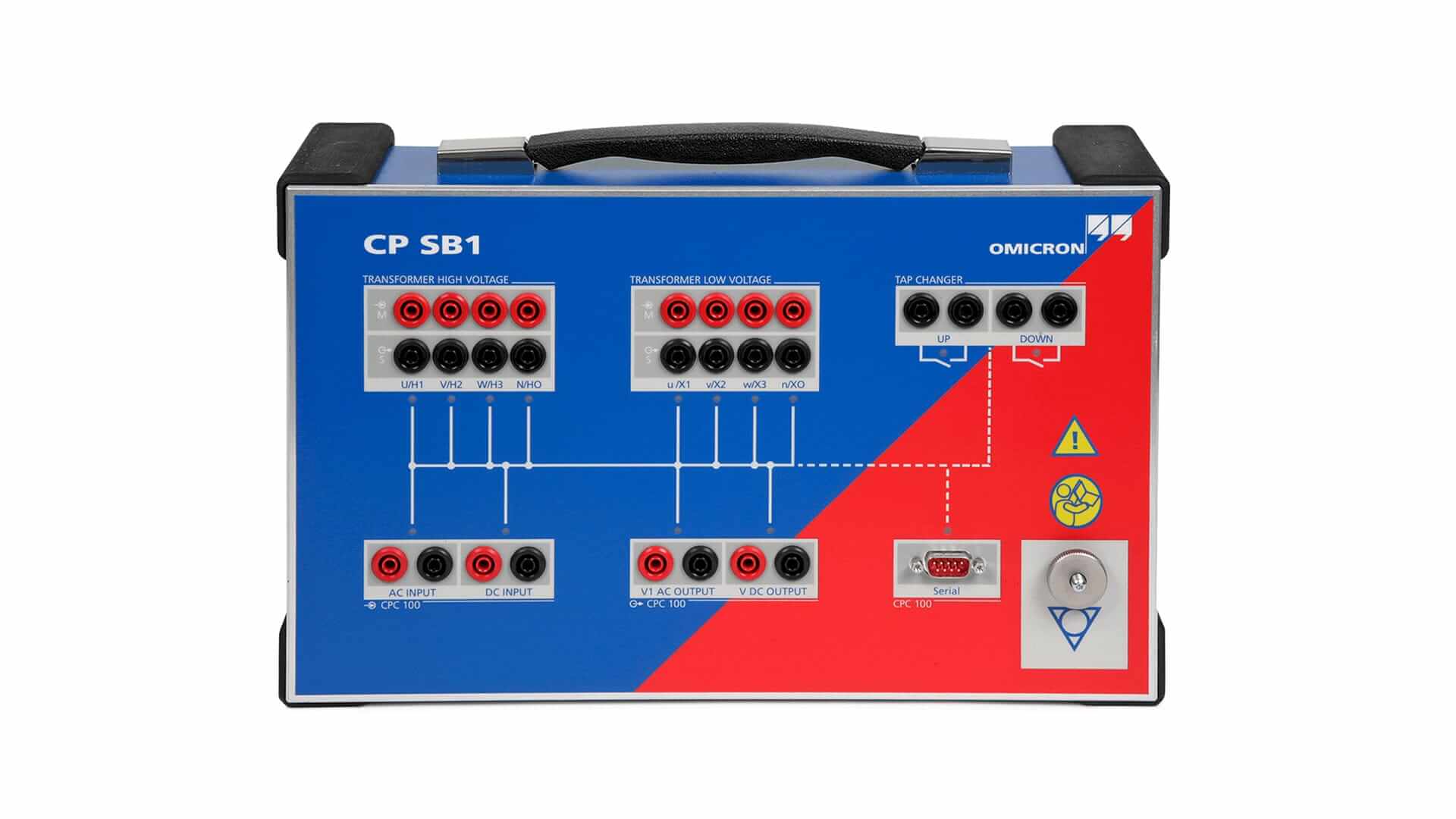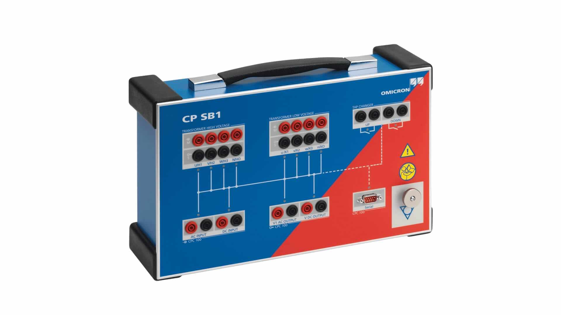 CP SB1 是一款專為 CPC 100 設計的三相開關箱 (switch box),用來簡化三相變壓器測試時的接線與操作流程。它可以自動切換相位、在各個分接頭 (tap changer) 位置下依序測試繞組比率與繞組電阻,無需在變壓器每相之間重複手動接線。這樣可以大幅加快測試速度,也提升現場操作安全性與準確性。